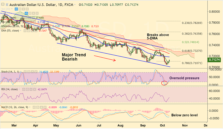 Support levels - 0.7086 (5-DMA), 0.7041 (Oct 8 lows), 0.7020 (channel base), 0.6976 (88.6% Fib)