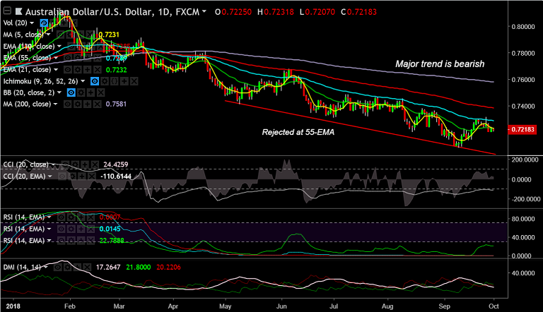 Resistance levels - 0.7232 (converged 5-DMA and 21-EMA), 0.7289 (55-EMA), 0.7315 (Sept 26 high)