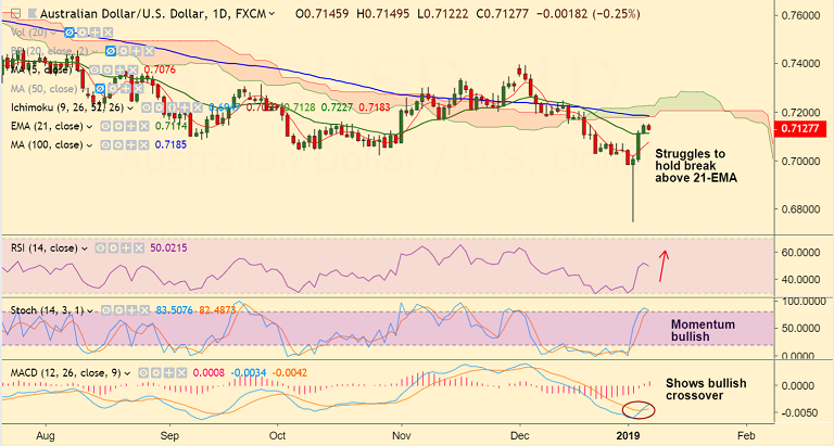 Support levels - 0.7114 (nearly converged 21-EMA and 20-DMA), 0.7076 (5-DMA), 0.6962 (Lower BB)
