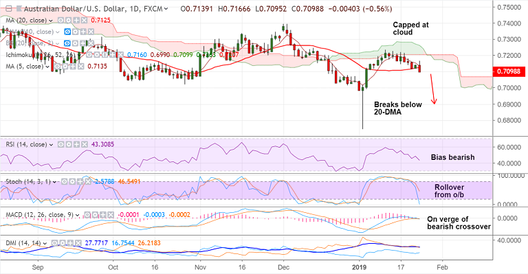 - The pair is extending downside after rejection at daily cloud. Price action has slipped below 20-DMA support raising scope for further downside.