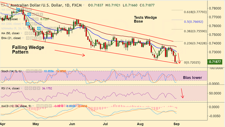- Price action is holding support at Wedge base at 0.7165, break below finds next strong support at 0.7145 (May 2016 low).