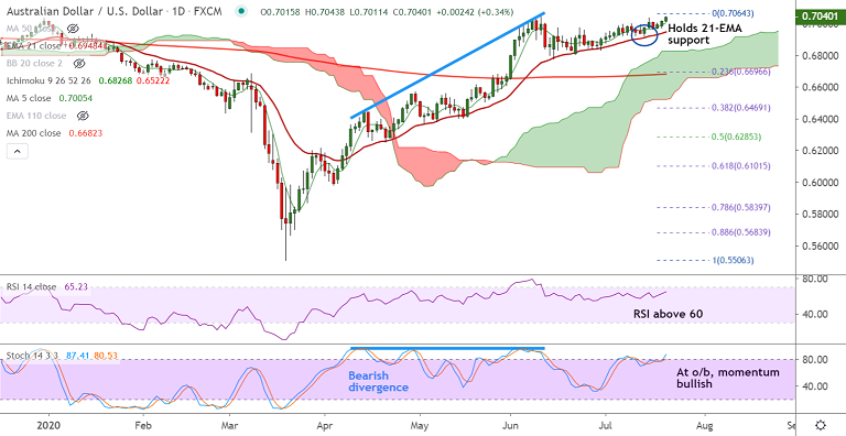 AUD/USD was trading 0.32% higher at 0.7038 at around 06:10 GMT, bias bullish.
