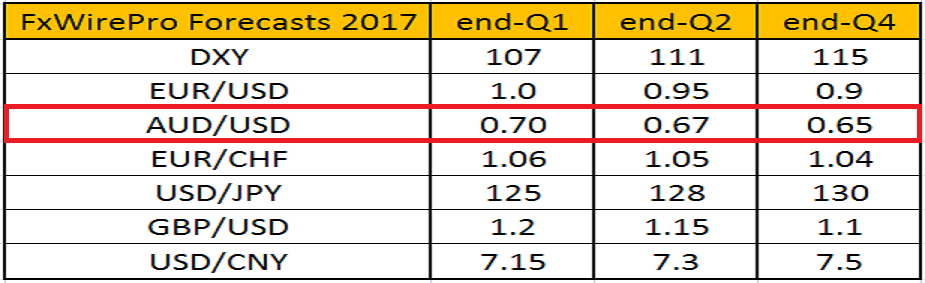 In 2016 the Australian dollar (AUD) has benefited from the recovery in commodity prices, but lost grounds at the end of the year to post U.S. Presidential election rally in U.S. Dollar. We expect this to continue even in 2017 following the Federal Reserve’s optimism on three interest rate hikes and President Donald Trump’s fiscal policies.