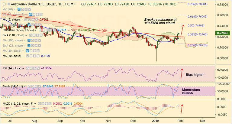 Resistance levels - 0.7297 (200-DMA), 0.7393 (Dec 2018 high), 0.7440 (50% Fib)
