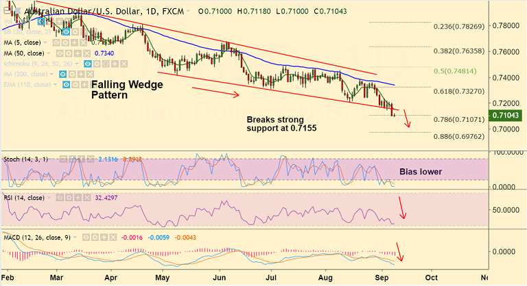 - Technical studies are bearish. Price action has broken strong support at Wedge base at 0.7155. Scope for test of 88.6% Fib at 0.6976.