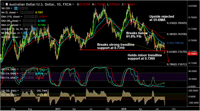 - Technicals remain bearish. Price action was rejected at 55-EMA and is hovering around minor trendline support at 0.7260.