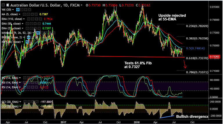 - Price action was rejected at 55-EMA and has slipped below 21-EMA at 0.7398.