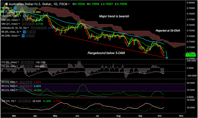 Resistance levels - 0.7094 (5-DMA), 0.71 (78.6% Fib)
