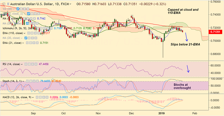 - AUD/USD slipped below 21-EMA, trades 0.31% lower on the day at 0.7135 at 0520 GMT.