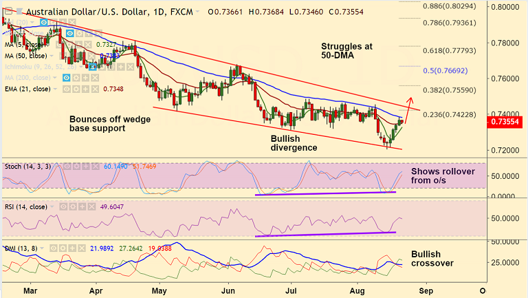- AUD/USD is technically on a major downward spiral. The major finds stiff resistance at 50-DMA at 0.7382.