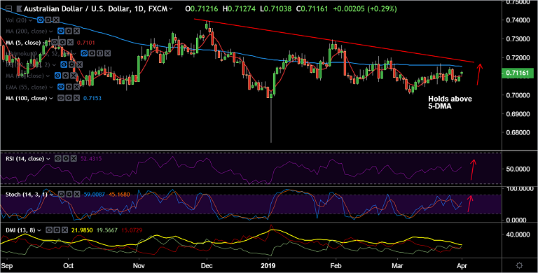 - The pair is struggling to extend bullish momentum, but holds support at 5-DMA at 0.7101.