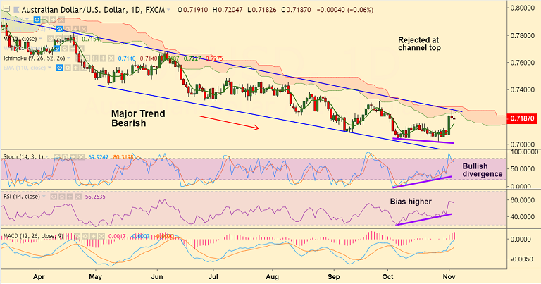 - Major trend for the pair remains bearish. Price action was rejected at channel top at 0.7250.