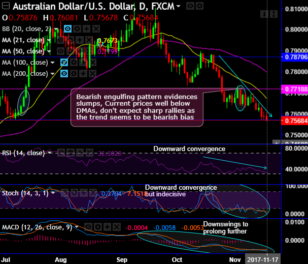 From last two weeks, AUDUSD trend has been tumbling ever since bearish engulfing and doji patterns have occurred at 0.7646 and 0.7677 levels (refer daily chart).