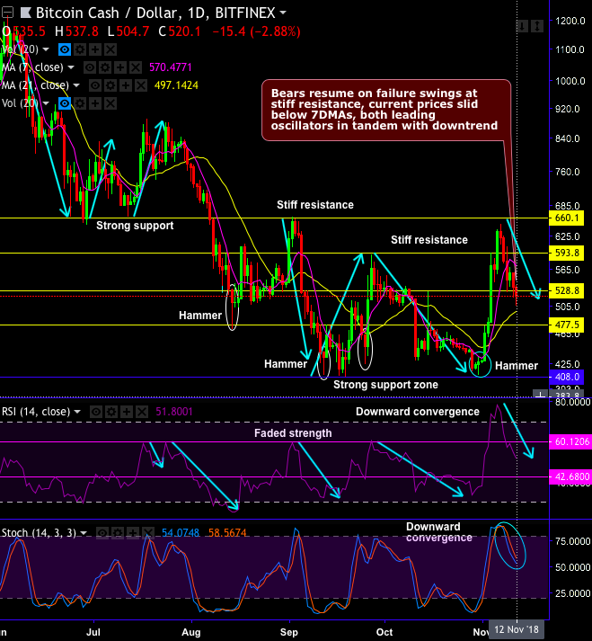 Although bitcoin cash (BCHUSD) has attempted to take-off rallies above DMAs on hammer formation, bulls seemed to have exhausted at the stiff resistance levels of $660 levels.