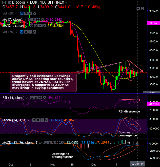 Technically, BTCEUR has formed dragonfly doji and bullish engulfing patterns at 2,906.50 and 3,525 levels respectively, these bullish pattern candlesticks take-off the price above DMAs, whereas the shooting star counters at 3,631.50 level, for now, the trend hovers at 7DMAs. Technical indicators have been little baffling with the prevailing price.