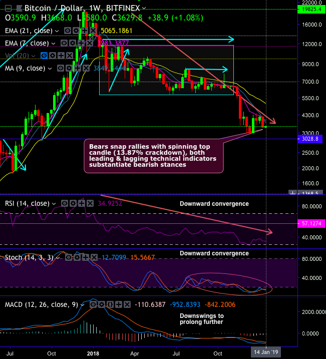 Let’s observe BTCUSD price movements as bears snap rallies with bearish engulfing candle at $3,591 levels (i.e. 13.87% crackdown on weekly terms), shooting star has popped-up at $51.59 levels, while both leading and lagging technical indicators substantiate bearish stances.