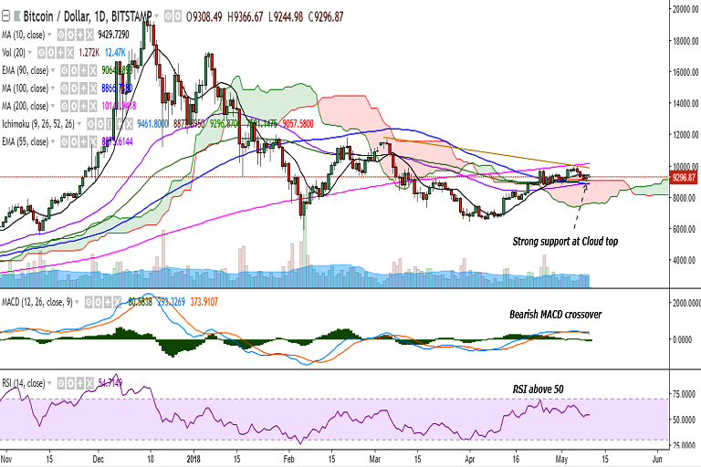 BTC/USD is extremely rangebound on Thursday as it faces strong resistance at 10-DMA. It is currently trading at 9261 levels at the time of writing (Bitstamp).