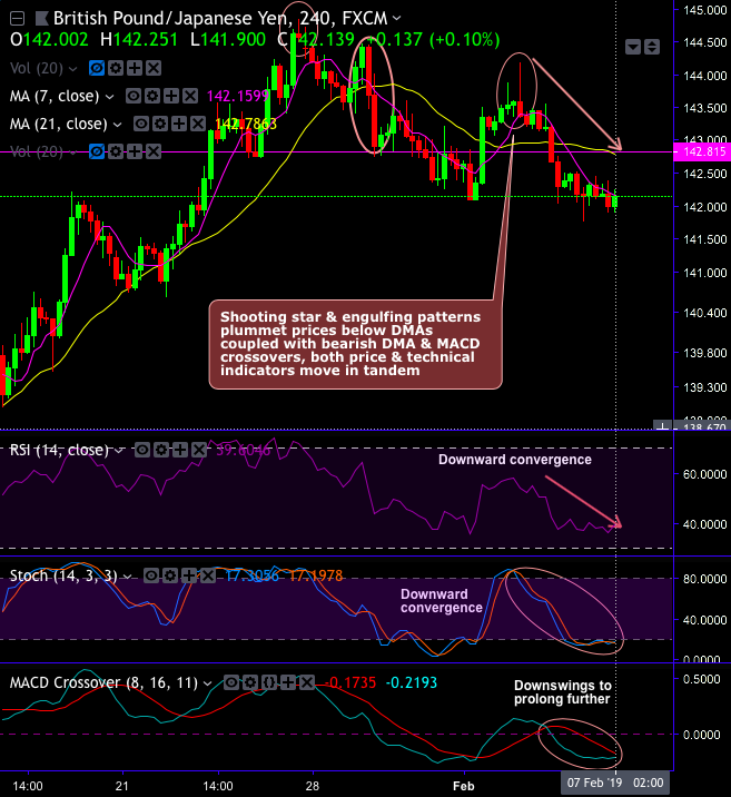 The major downtrend retraces 78.6% Fibonacci levels upon engulfing & rail-road patterns, hammer most likely to occur at 142.721 levels. Bulls counter on the most likely hammer, both momentum indicators in line with the price dips. As a result, today’s trend has been attempting to slide further below 7SMAs.