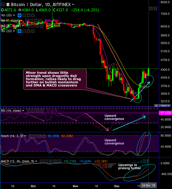 On the eve of Christmas and New Year, with great deal optimism or positivity, bitcoin and its crypto-peer group prices have continued its bullish streaks that have taken place since mid-December. BTCUSD price has rallied to $4,336 levels or up +6.47%, while ETHUSD has also climbed above $151 levels (i.e. up about 13.14%) and so is LTCUSD, spiked-off $36 levels (or +7.99%).