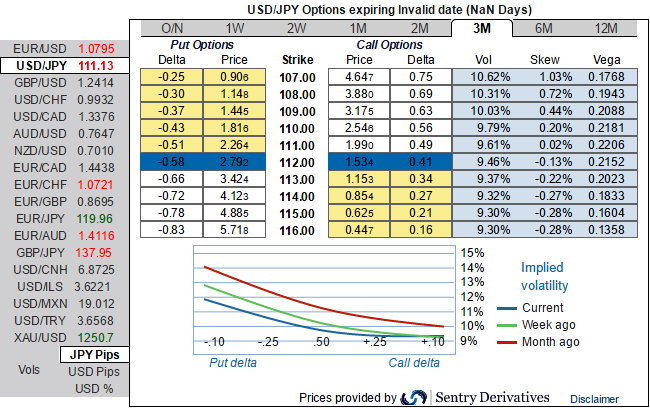 At spot reference: 111.099, USDJPY 3m risk reversals and positively skewed IVs are indicating hedging interests for downside risks still remain intact (while articulating).