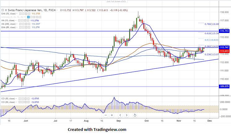 CHFJPY has shown a good recovery of more than 70 pips and hits high of 113.80. The pair has formed almost a triple top (113.85,113.86 and 113.80) and is currently trading around 113.67.