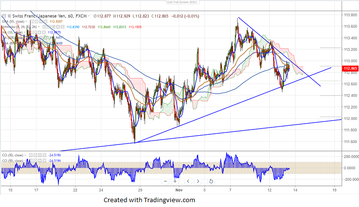 CHFJPY has halted its weakness around 111.59 and shown a 200 pips jump from that level. It hits high of 113.70 and shown a minor selling from that level. It is currently trading around 112.83.