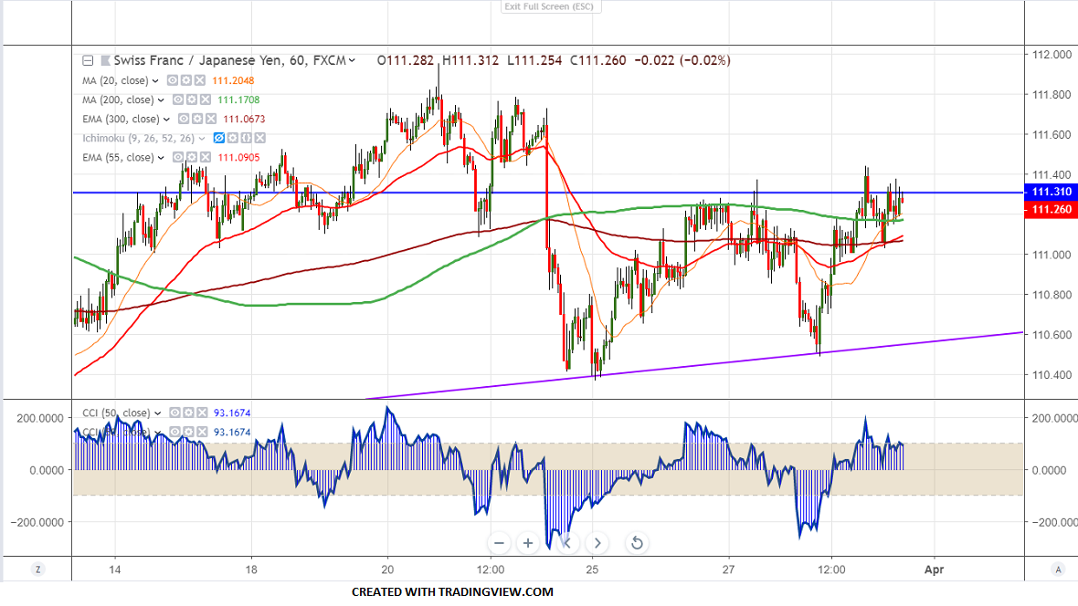 CHFJPY has shown a massive recovery of more than 80 pips from low of 110.48. The jump was due to slight weakness in yen. The yen was trading stronger on declining US bond yield and yield inversion. But slight recovery in global market on US-China trade optimism is preventing Yen from upside. USDJPY has shown a good jump of nearly 80 pip from the low. So overall trend of CHFJPY is strong as long as trend line support 110.50 holds. It is currently trading around 111.25.
