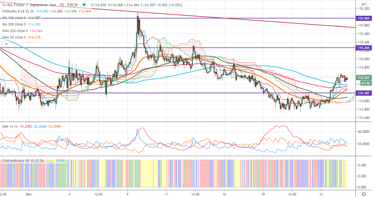 In the 60 min chart, CHFJPY is trading above 200 H MA. Any violation above 114.60 will take to the next level till 115/115.35. On the lower side, near term support is around 113.75, and any indicative break below targets 113/112.