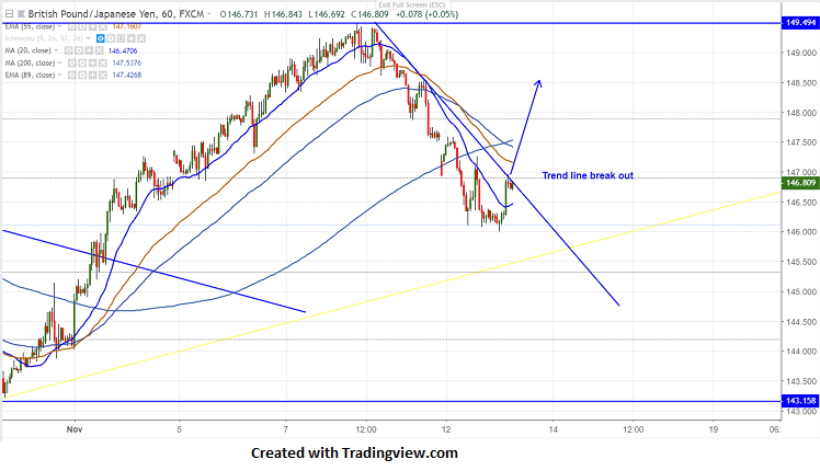 Any break above trend line resistance at 146.85 confirms minor intraday bullishness , a jump till 147.52 (200- H MA) and any convincing close above 200- H MA will take the pair till 148.16 (61.8%fib)/149.50-70. The decline from 156.60 will get completed at 139.87 only if pair breaks convincingly above 149.70.
