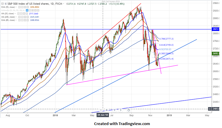 S&P500 has jumped more than 30 points yesterday on slightly easing trade tension between US and China. The index hits high of 2687 and has closed above 10- day MA (2675). S&P500 has formed temporary top around 2818 and lost more than 150 points. It is currently trading around 2690 0.20% higher.