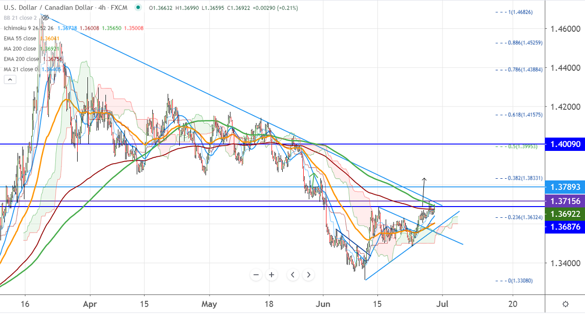 USDCAD recovered more than 70 pips on a slight jump in the US dollar. The risk-off sentiment due to the surge in coronavirus cases in the U.S is putting pressure on the Canadian dollar. It hits an intraday high of 1.36990 and is currently trading around 1.36941.