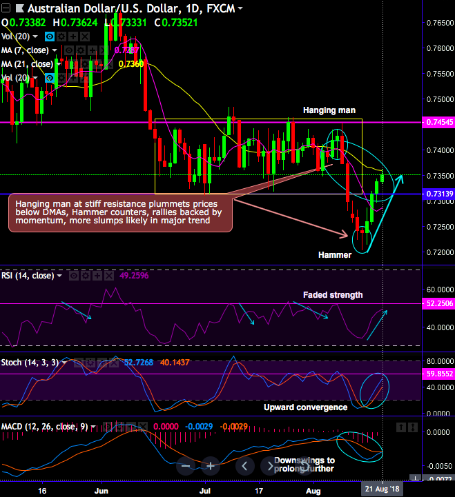 AUDUSD forms hanging man and hammer patterns at 0.7428 and 0.7238 levels respectively and the stiff resistance at 0.7369 (21DMA) and 0.7454 levels and strong support at 0.7315 areas are observed.