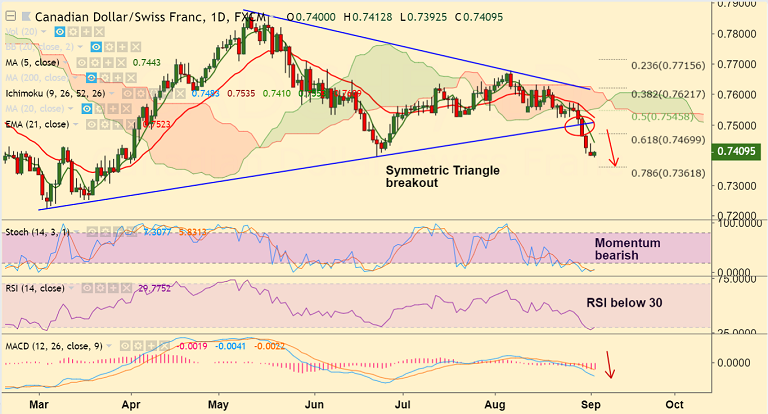 Recommendation: Good to go short on upticks around 0.7420/40, SL: 0.7523, TP: 0.7365/ 0.73/ 0.7290