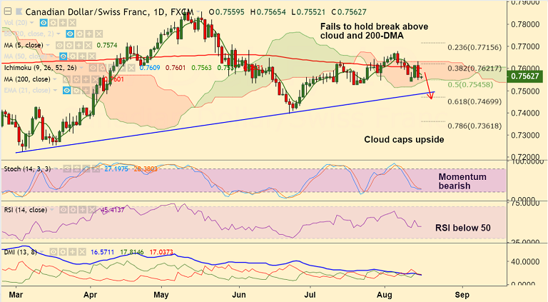 - The pair is currently trading below 200-DMA and with daily cloud. Break below cloud will see further weakness.