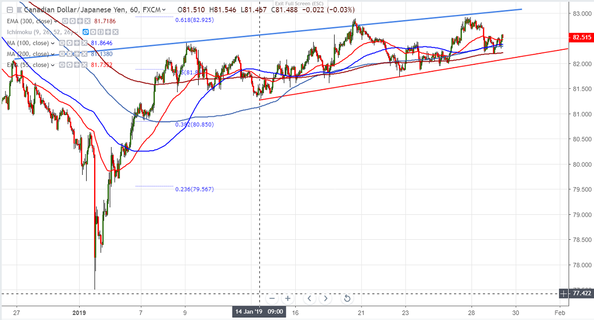 CADJPY is trading higher for the day and jumped nearly 40 pips after taking support near 300-H EMA. The JPY was trading lower against all majors in European session after a sudden recovery in UK and Germany stock markets. The pair hits high of 82.58 and is currently trading around 82.51.