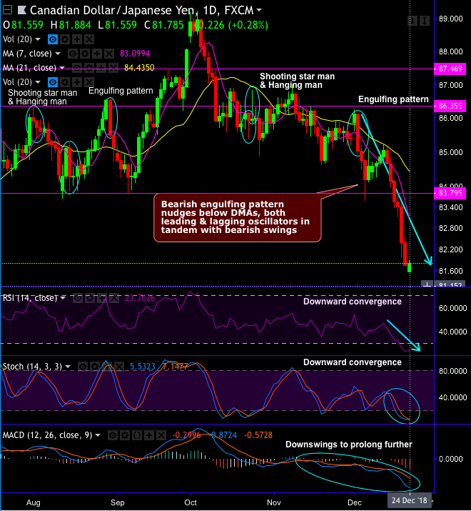 Take a Glance at Technical analysis: CADJPY forms bearish engulfing pattern at 85.025 and 81.741 levels on daily and weekly terms that nudges price towards DMAs and EMAs respectively.