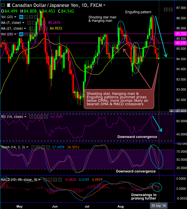 On daily plotting, CADJPY forms shooting star, hanging man & bearish engulfing candlestick patterns have occurred at 85.904, 85.723 and 85.473 levels that plummet prices below DMAs.