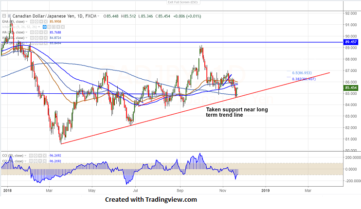 CADJPY has shown very nice recovery from the trend line support 84.61 almost 100 pips and is currently consolidating. The pair has made temporary top around 86.98 and shown minor weakness. The pair hits low of 84.61 and is currently trading around 85.40.