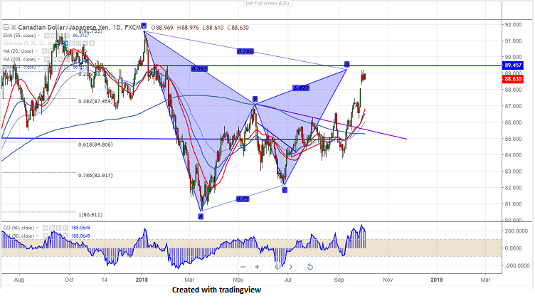CADJPY has halted its two weeks of continuous bullishness after goo gap up opening. It hits high of 89.21 and is currently trading around 88.61. The pair has formed Bearish Gartley pattern and any break above 91.58 confirms bullish continuation.