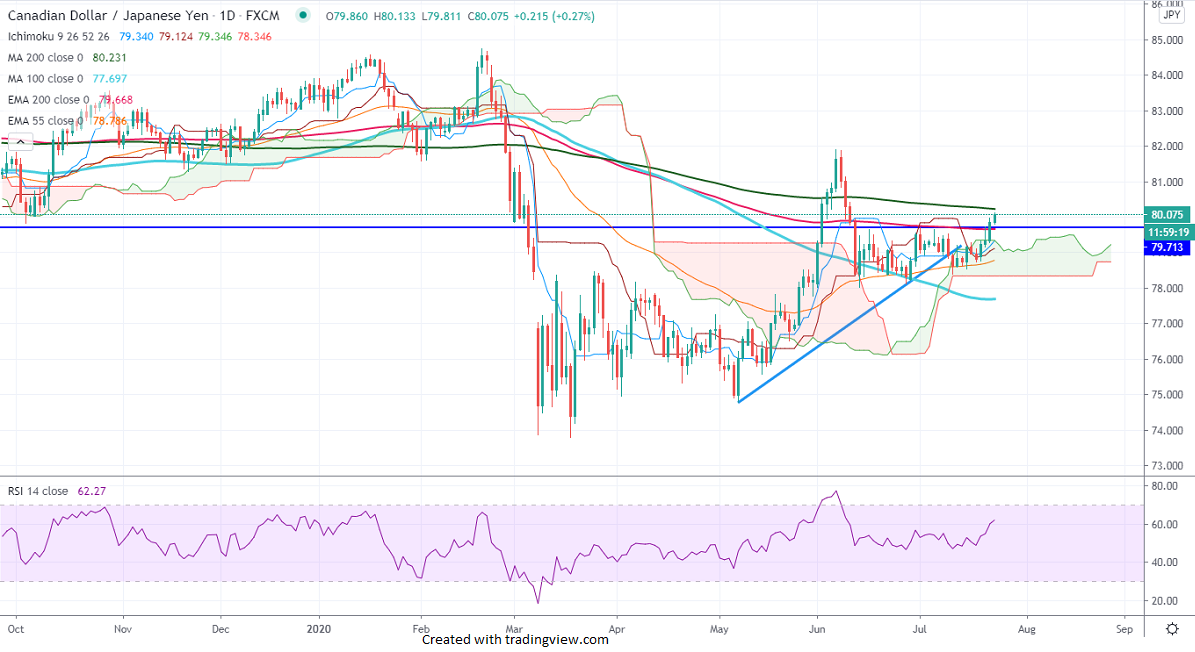 CADJPY recovered sharply from a low of 78.38 on Jul 10th, 2020. The intraday trend is bullish as long as support 79.28 holds. The jump was mainly due to bullishness in the Canadian dollar and crude oil prices. USDCAD is one of the worst performers this week and declined more than 200 pips from a high of 1.3600. The Canadian CPI came at 0.7% from a year ago vs 0.4% in May and Core inflation edged higher to 0.4% compared to previous -0.1%.