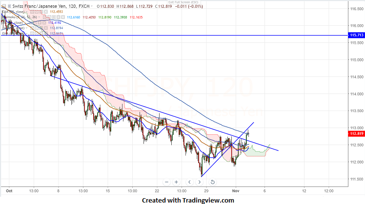 CHF/JPY has formed a minor bottom around 111.55 and shown a jump of more than 100 pips from that level. It hits high of 112.95 and is currently trading around 112.82.