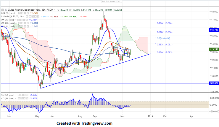 CHF/JPY recovered almost more than 50 pips yesterday. The pair continues to trade higher for second consecutive days and broken high of 113.32 made yesterday and jumped till 113.50.This shows that pair formed minor bottom around 112.19 and a further weakness only below that level. It is currently trading around 113.30.