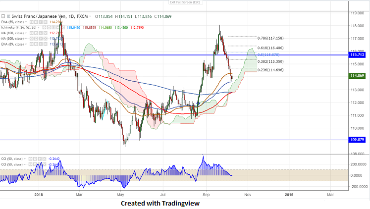 CHFJPY has formed almost a double bottom near 113.60 and shown a minor jump. The pair is facing minor resistance around 114.25 (55- day EMA) and any violation above targets 114.69 (23.6% fib)/115.25 (10-day MA)/115.80.