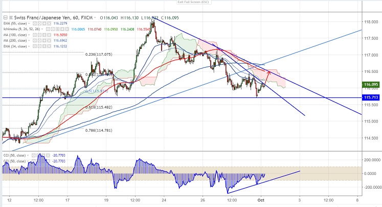CHF/JPY has shown a major sell-off in past two weeks and lost more than 200 pips. The pair hits low of 115.70 and shown a minor jump. It is currently trading around 116.09.