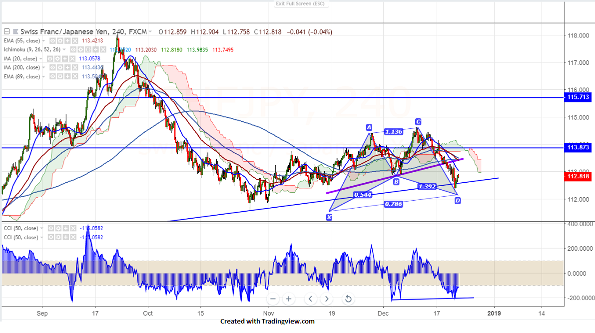 The pair has halted its one week decline and shown a minor jump from low of 112.24. CHFJPY has almost formed a double bottom near 112.20. It is currently trading around 112.82.