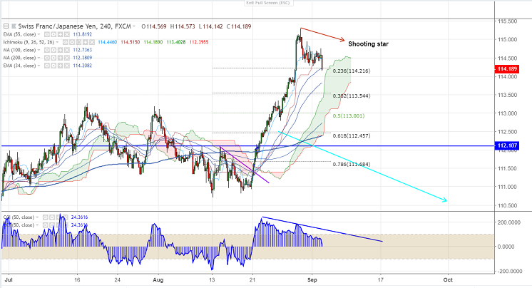 CHFJPY has halted its 2-weeks continuous bullishness and lost more than 100 pips from the high. The pair jumped more than 400 pips from the low of 110.83 and hits high of 115.29. It is currently trading around 114.30