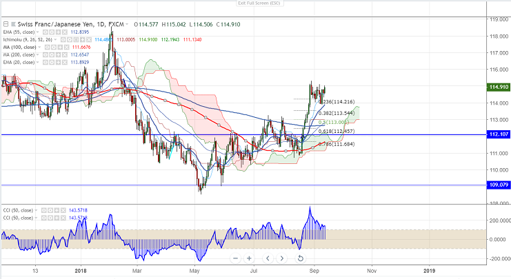 CHF/JPY has taken support near 20- day EMA and shown a good jump of more than 100 pips. The pair hits high of 115.04 and is currently trading around 114.92.