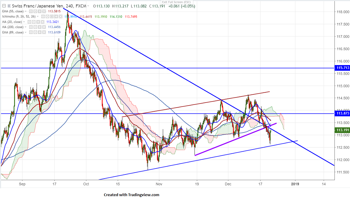 The pair has halted its one week decline and shown a minor jump from low of 112.61. CHFJPY has taken support near trend line and any further weakness only below 112.50. It is currently trading around 113.18.