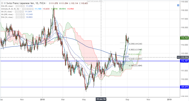 CHF/JPY has taken support exactly at Tenken-sen and shown a good jump of 90 pips. The pair hits high of 114.94 and is currently trading around 114.78.