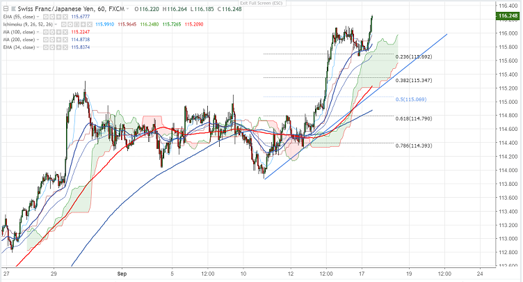 As per our analysis CHF/JPY was trading higher after a minor decline of 40 pips from the high of 116.08. The pair has broken yesterday’s high of 116.08 and jumped till 116.21.It is currently trading around 116.20.